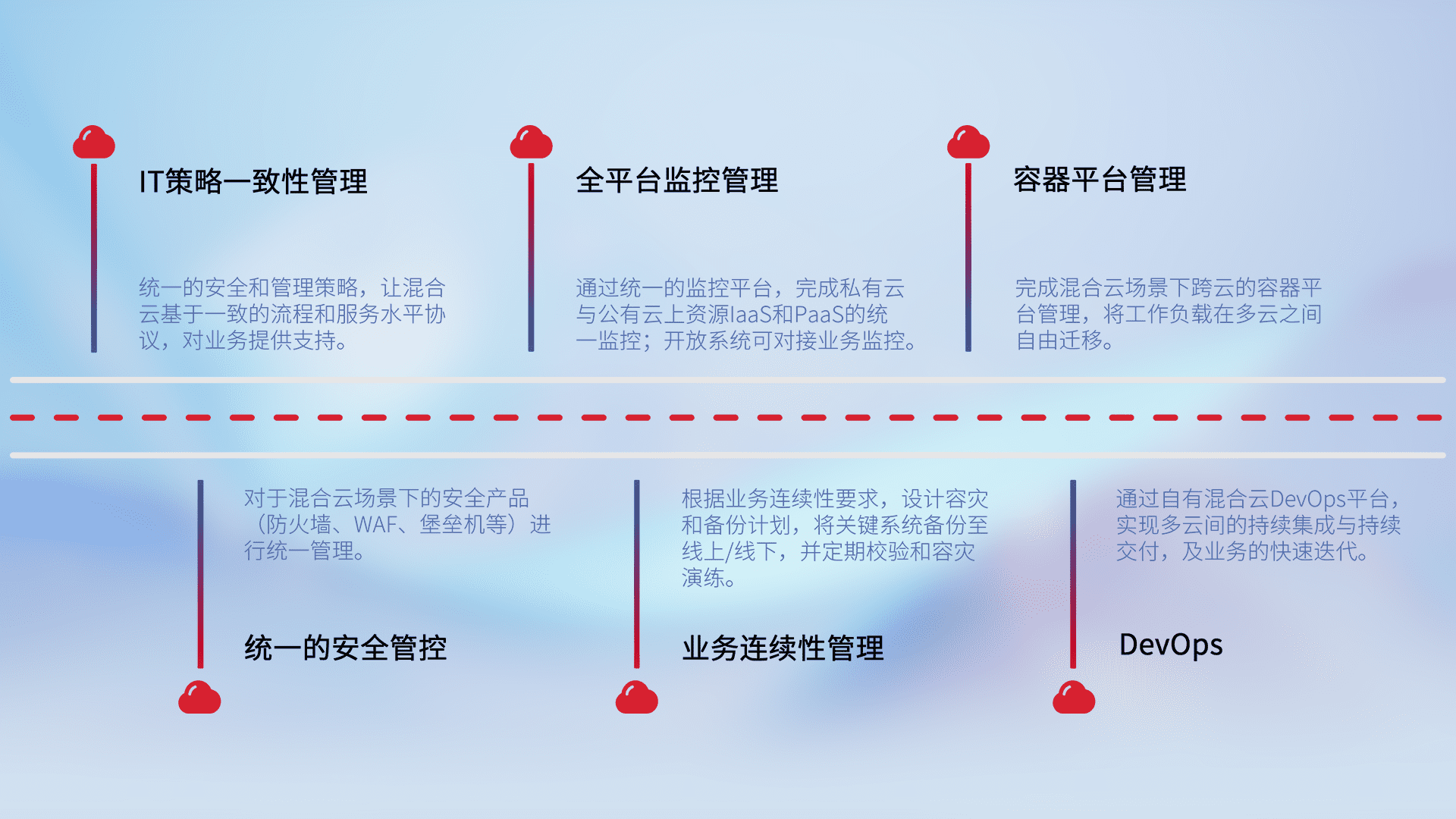 通过多云纳管,,,,以统一的资源数据模型把客户的云资源进行抽象和封装,,,,进而实现对多云资源的统一操作,,保障云资源管理的可靠性、、稳定性与可用性。。。。量身定制化运维内容,,,,配置、、、开发运维、、、、补丁管理、、、备份、、、、监控、、认证和访问管理、、、审计和日常巡检等,,,保障在用云过程中的可靠度,,稳定度以及高可用率。。。